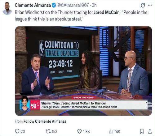 ESPN記者布萊恩-文霍斯特在播客節(jié)目中這樣說道:聯(lián)盟內部人士普遍認為,雷霆4換1得到麥凱恩是絕對劃算的。他在節(jié)目中提到了4個要點,因為篇幅太長,我這里就精簡一下他的觀點: