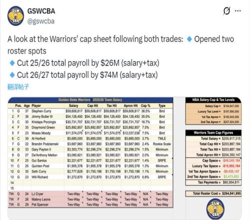 勇士在去年夏天引進了霍福德,如今又將波神招致麾下,這樣一來綠軍2023-24賽季奪冠時的兩大中鋒都來到了勇士。有些遺憾的是,這兩位大個子的狀態(tài)比兩年前又下滑了一些。勇士是不可能指望靠這樣的陣容去沖擊冠軍的。勇士這筆交易背后的一個目的是省錢。通過這筆交易,勇士在本賽季共計節(jié)約2600萬美元薪水和奢侈稅,能在下賽季節(jié)約7400萬美元薪水和奢侈稅,合計預(yù)計節(jié)約1億美元。