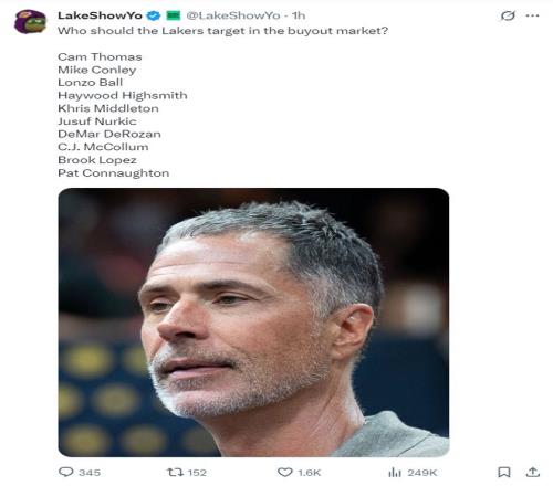 湖人媒體LakerShowYo曬出了潛在的買斷市場名單,他認為這些球員是湖人可以嘗試追求的對象:托馬斯、康利、朗佐鮑爾、海史密斯、米德爾頓、努爾基奇、德羅贊、麥科勒姆、大洛、康諾頓。