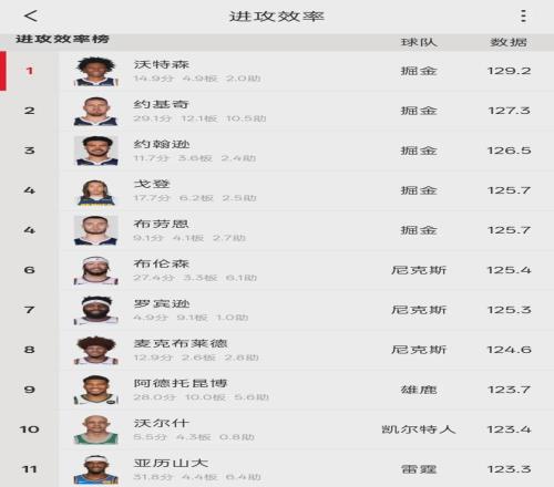 本賽季沃特森為掘金打了49場,其中39場首發(fā)。場均出戰(zhàn)30.7分鐘,得到14.9分4.9籃板2助攻1搶斷1.2蓋帽1.8失誤,三項命中率:49.6%,41.7%,72.7%。三分命中率聯(lián)盟第20,場均能命中1.5記三分,進攻效率聯(lián)盟第1。