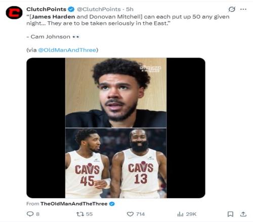 掘金球員卡梅倫-約翰斯在直播時談到哈登+米切爾的組合,他表示:騎士隊(duì)會變得非常強(qiáng)大,因?yàn)楣?、米切爾兩人都是可以一?0+的球員,米登組合會非常之恐怖。