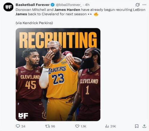 帕金斯還透露一個細(xì)節(jié),在今夏休賽期,米切爾與哈登兩人都會來說服詹姆斯簽約克利夫蘭,大家一起沖擊總冠軍。