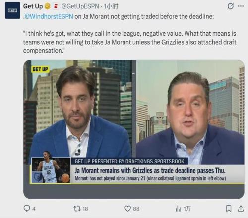 北京時(shí)間2月7日,ESPN名記Brian Windhorst在節(jié)目中,談及灰熊為何沒能送走莫蘭特:“很多人都說莫蘭特毫無價(jià)值,但我覺得這個(gè)說法并不準(zhǔn)確。因?yàn)槲艺J(rèn)為他現(xiàn)在就是負(fù)資產(chǎn),除非灰熊倒貼選秀權(quán),否則沒有球隊(duì)愿意接手?!?/p>
