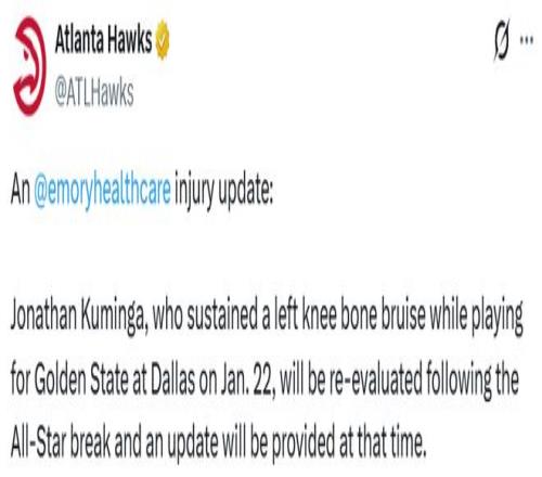 這位23歲球員在1月22日對陣獨行俠的比賽中左膝過度伸展,那場比賽也成為他效力勇士的最后一戰(zhàn)。隨后,庫明加與希爾德一同被交易至老鷹,勇士則得到波爾津吉斯。