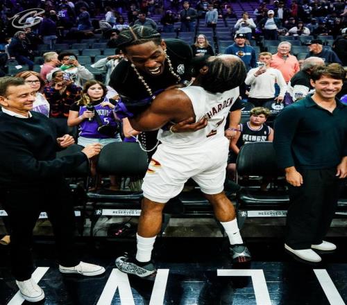 TravisScott現(xiàn)場觀戰(zhàn)哈登騎士首秀,兩人賽后激情相擁