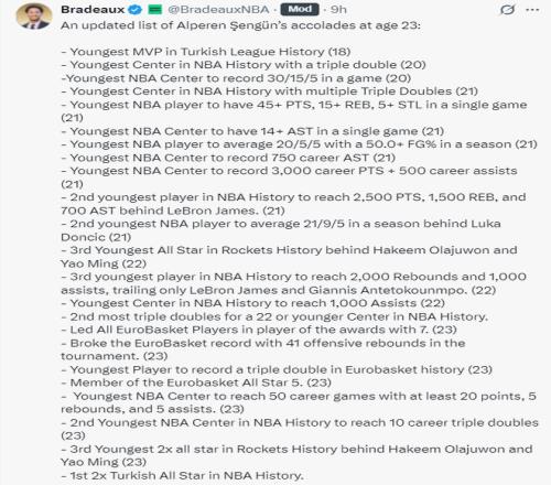 火箭記者Bradeaux曬出23歲的阿爾佩倫-申京所獲得的榮譽(yù)清單: