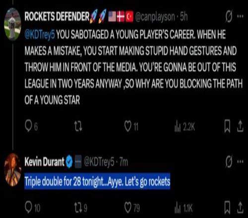 對(duì)陣黃蜂一戰(zhàn),杜蘭特曾炮轟申京該努力防守,這讓很多火箭球迷炮轟杜蘭特認(rèn)為KD影響了申京的成長,一位球迷寫道:你毀掉了一位年輕球員的職業(yè)生涯。他犯錯(cuò)時(shí),你便做出愚蠢的手勢(shì),還把他推到媒體面前。反正你兩年后就會(huì)被聯(lián)盟淘汰,何必阻礙一位新星的成長之路?