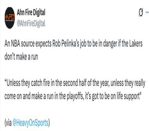 美媒Heavy報道稱,一位NBA消息源稱:“除非湖人下半程突然爆發(fā)、在季后賽打出一番成績,否則佩林卡的位置岌岌可危,很難繼續(xù)留任。擁有詹姆斯和東契奇,今年還要打附加賽的話,已經(jīng)沒什么借口可找。佩林卡在聯(lián)盟里還有威信嗎?他有清晰的建隊藍圖嗎?這才是問題所在?!?/strong>