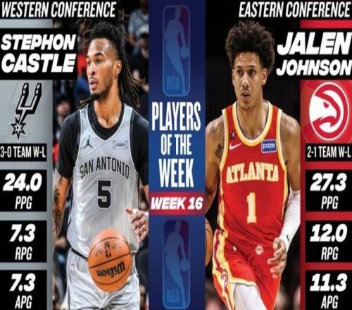 NBA官方公布了第16周的東西部周最佳球員,東部由老鷹前鋒杰倫約翰遜當(dāng)選,西部由馬刺后衛(wèi)卡斯?fàn)柈?dāng)選。杰倫約翰遜上周場均豪取27.3分+12籃板+11.3助攻,帶領(lǐng)老鷹取得2勝1負的戰(zhàn)績。據(jù)統(tǒng)計,這是杰倫約翰遜本賽季第2次拿到周最佳球員獎??ㄋ?fàn)柹现軋鼍暙I24分+7.3籃板+7.3助攻,帶領(lǐng)馬刺隊取得3勝0負的戰(zhàn)績。據(jù)統(tǒng)計,這是卡斯?fàn)柹氖状潍@得該獎項。除此之外,猛龍隊的巴恩斯、尼克斯隊的布倫森和唐斯、76人隊的大帝和馬克西、騎士隊的米切爾、雄鹿隊的羅林斯、開拓者隊的克林根和格蘭特、快船隊的小卡、鵜鶘隊的墨菲和馬刺隊的文班亞馬等球星獲得了周最佳提名。