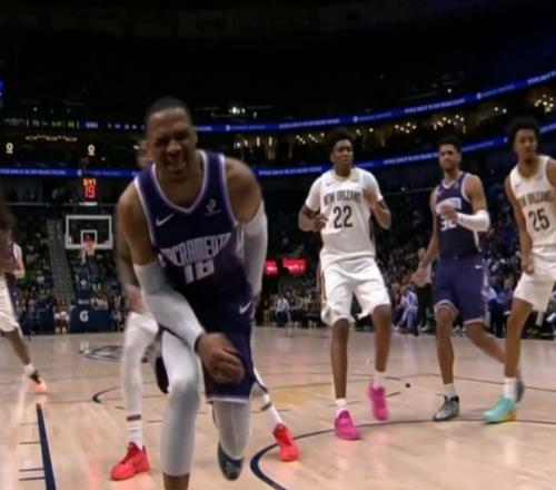 易邊再戰(zhàn),錫安連續(xù)突破得手一人連拿6分,特雷-墨菲三分連中,鵜鶘領(lǐng)先國(guó)王多達(dá)21分。阿丘瓦上籃不中,威少?zèng)_刺跟進(jìn)收下前場(chǎng)板并順勢(shì)完成隔人補(bǔ)扣,開(kāi)心笑了。威少?gòu)?qiáng)突不慎踩到對(duì)手腳背明顯崴腳,表情痛苦,但好在并無(wú)大礙,鵜鶘竟然選擇挑戰(zhàn),最終失敗血虧還送兩次罰球??ㄌ厥д`,墨菲三世搶斷后助攻菲爾斯完成快攻得分,米西再暴扣打成2+1,鵜鶘打出一波17-2超級(jí)攻擊波,已經(jīng)領(lǐng)先國(guó)王到30分。