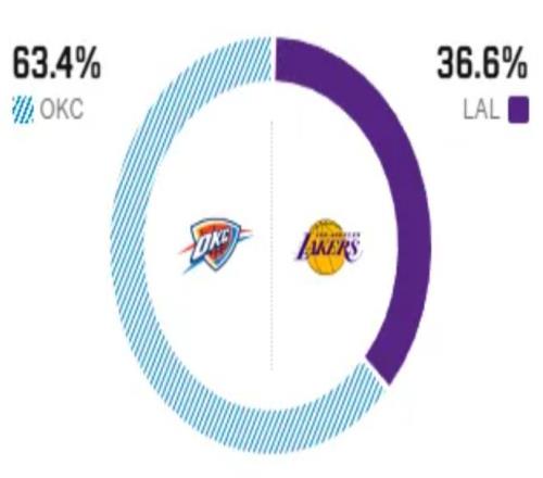 賽前,美媒ESPN對本場比賽進行了勝率預(yù)測,湖人隊勝率僅有36.6% ,雷霆勝率則高達63.4% ,差距非常明顯。