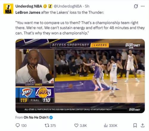 勒布朗-詹姆斯在賽后直言與雷霆的差距很大,他表示,雷霆是總冠軍級(jí)別的球隊(duì)而湖人不是,湖人的防守效率聯(lián)盟第一,從各種數(shù)據(jù)來(lái)看雷霆都是頂尖球隊(duì),他們給持球者施加了很多壓力,他們有華萊士、卡魯索、杰威那樣的頂級(jí)防守球員,我們已經(jīng)嘗試按照計(jì)劃去執(zhí)行,但他們的防守可以讓我們遠(yuǎn)離我們喜歡的得分區(qū)域。