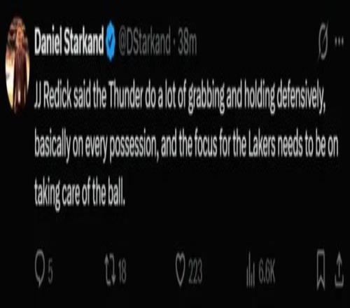 湖人110-119不敵雷霆,這場(chǎng)比賽湖人輸?shù)姆浅1锴?,雷迪克的兩次挑?zhàn)都是非常明顯的誤判,而且在末節(jié)多爾特絆倒了里夫斯,但裁判就在邊線卻視而不見(jiàn),華萊士還有一個(gè)明顯界外球裁判也視而不見(jiàn)。