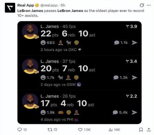 詹姆斯這場(chǎng)比賽拿到22+10+6,連續(xù)三場(chǎng)比賽拿到10+助攻是歷史最年長(zhǎng)的球員,而詹姆斯的言論就是側(cè)面說(shuō)明湖人陣容孱弱,而且湖人根本沒(méi)有雷霆那樣的防守資源。