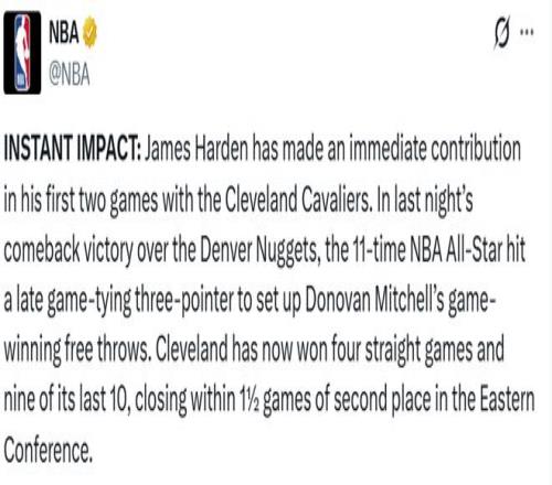 NBA官方也對(duì)哈登加盟騎士后的作用給予很高的評(píng)價(jià)。NBA官方賬號(hào)寫(xiě)道:“即時(shí)效應(yīng): 詹姆斯-哈登在加盟克利夫蘭騎士的前兩場(chǎng)比賽就立刻做出了貢獻(xiàn)。在昨晚逆轉(zhuǎn)擊敗丹佛掘金的比賽中,這位11屆NBA全明星命中了一記關(guān)鍵的扳平三分,為米切爾的絕殺罰球奠定了基礎(chǔ)、騎士目前已經(jīng)取得四連勝,近10場(chǎng)比賽贏下9場(chǎng),與東部第二的差距僅剩1.5個(gè)勝場(chǎng)?!?/p>