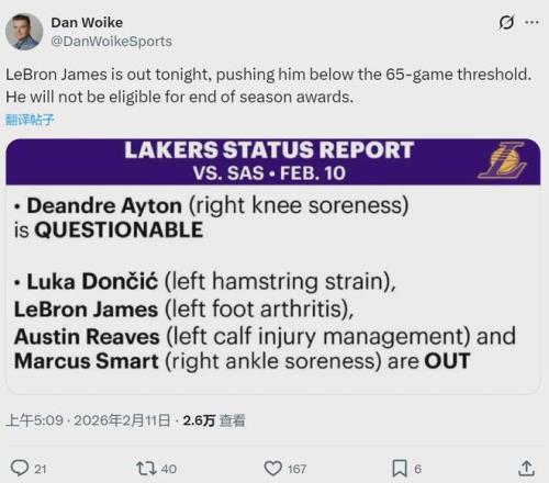 北京時(shí)間2月11日上午11點(diǎn)半,湖人背靠背主場(chǎng)迎戰(zhàn)馬刺。賽前湖人官方宣布,四名球員因傷休戰(zhàn):詹姆斯(左腳)、東契奇(左腿筋拉傷)、里夫斯(左小腿)、斯瑪特(右腳踝酸痛)。這是詹姆斯本賽季缺席的第18場(chǎng)比賽!