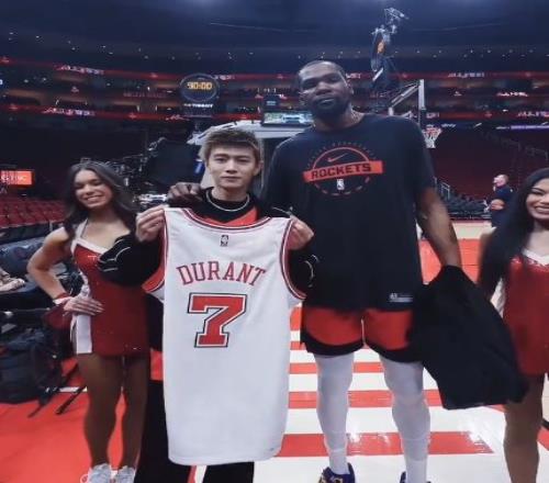 中國明星任嘉倫現(xiàn)身火箭主場觀戰(zhàn),與杜蘭特互換禮物。