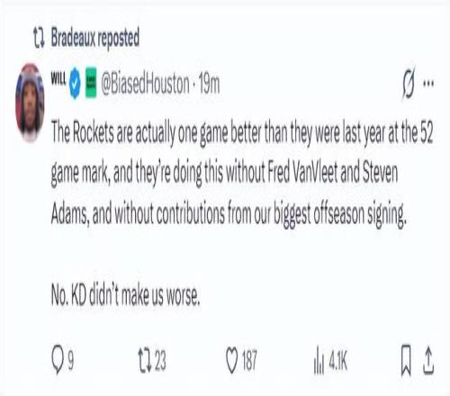 火箭升西部第3!前52戰(zhàn)33勝超去年休媒:杜蘭特并沒有讓我們更糟