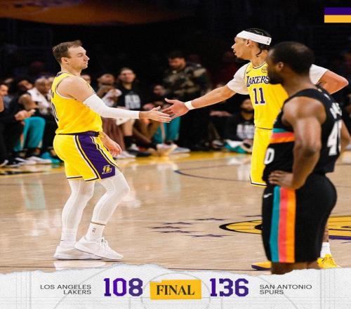 湖人隊(duì),肯納德8中5得到了14分2板5助、蒂米8中5,三分球3中2得到了14分2板、海斯7中6得到13分4板3助、拉拉維亞6中3得到10分2板1助、克內(nèi)克特8中4得到9分5板1助、巴夫金10中2,三分球5中1得到7分2板1助、八村塁12中3,三分球3中0得到6分4板2助2斷、范德比爾特5中2得到6分4板2助、克萊伯6分3板、尼克史密斯6分2板1助、蒂耶羅3分、馬農(nóng)2分1板1助。