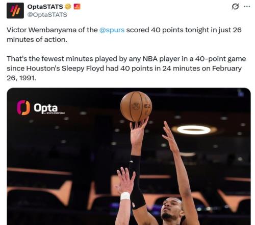 他還僅花費(fèi)26分零6秒,也讓文班亞馬成為NBA近35年單場拿到40+得分用時最短的球員。