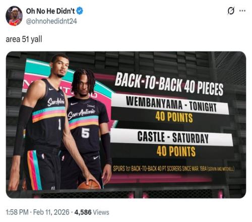 因?yàn)椴粌H是文班,卡斯?fàn)?、哈珀與卡特布萊恩特三大新星的表現(xiàn)也是可圈可點(diǎn),過去兩場文班與卡斯?fàn)栠B續(xù)砍下40+成為馬刺自1984年格文和邁克-米切爾后,首對在連場砍下40+的雙人組。