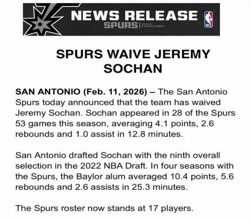 北京時(shí)間2月12日,圣安東尼奧馬刺隊(duì)官方宣布,球隊(duì)已裁掉杰里米-索漢。本賽季,索漢代表馬刺出戰(zhàn)了53場(chǎng)比賽中的28場(chǎng),場(chǎng)均登場(chǎng)12.8分鐘,得到4.1分、2.6個(gè)籃板和1.0次助攻。