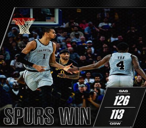 文班亞馬助攻??怂固兜梅?,格林回敬遠投。格林搶斷??怂?,隨后助攻波杰姆斯基籃下得手。分差僅為7分,勇士看到贏球希望。凱爾登約翰遜強攻禁區(qū)得手,格林失誤,文班亞馬2罰全中。格林再次失誤,??怂贡┛邸I5滤惯h投不進,比賽時間走完。最終,馬刺以126比113力擒勇士,得以上演16分逆轉好戲。圣安東尼奧豪取6連勝,鞏固了西部第2的排位。勇士末節(jié)以19比32落后,慘遭翻盤。