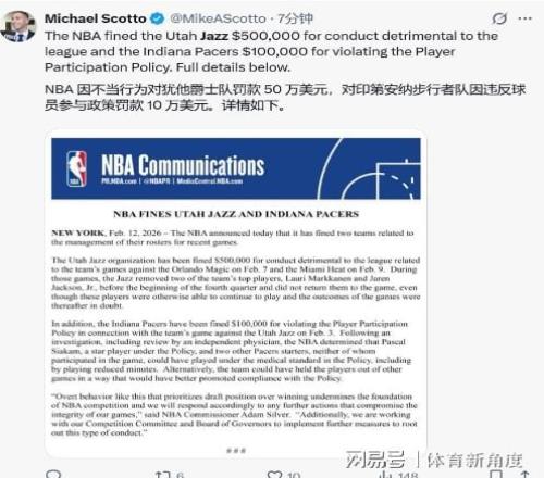 面對(duì)輿論風(fēng)暴,NBA官方于北京時(shí)間9時(shí)30分重拳出擊:爵士因連續(xù)兩場(chǎng)第四節(jié)惡意輪休3J與馬爾卡寧被處以50萬美元罰款,步行者則因違規(guī)輪休西亞卡姆遭罰10萬美元(兩隊(duì)傷病報(bào)告均違反聯(lián)盟新輪休規(guī)定)。聯(lián)盟同步發(fā)布嚴(yán)正聲明:"任何為追求選秀權(quán)益而公然犧牲比賽公正性的行為,都將動(dòng)搖NBA的競(jìng)技根基。"