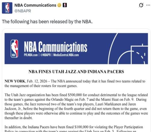 在全明星周末即將開打之際,NBA官方突然宣布重磅罰單,爵士與步行者因比賽陣容管理問題被處罰,其中爵士被罰50萬美元,步行者被罰10萬美元。