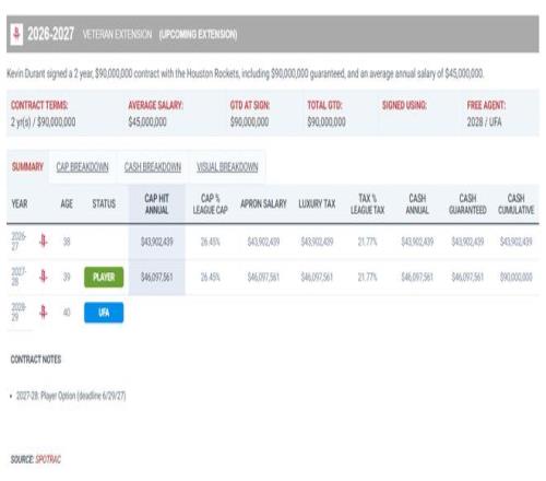 杜蘭特此前與火箭隊(duì)達(dá)成了兩年9000萬(wàn)的提前續(xù)約,他本賽季的薪水是5470萬(wàn),26-27賽季4390萬(wàn),27-28賽季4609萬(wàn)(球員選項(xiàng)),這份合同結(jié)束后他因?yàn)?8歲條款就只能一年一簽,他的薪資也必然會(huì)迎來(lái)大幅度的下滑,因?yàn)檫@份合同執(zhí)行完他就39歲(也有可能退役)。