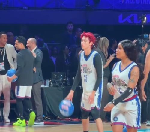 王鶴棣染一頭紅發(fā)亮相NBA名人賽,多次沖擊籃下得手,全場9投5中,得到10分4籃板