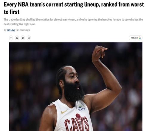美媒評30隊首發(fā)實力!騎士獲哈登后飆升第4火箭第7湖人17存爭議