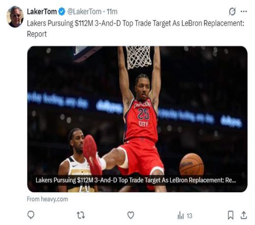 北京時間2月14日晚,湖媒Laker Tom也透露,在2026年休賽期湖人隊有引進(jìn)三年1.12億合同的墨菲的打算。