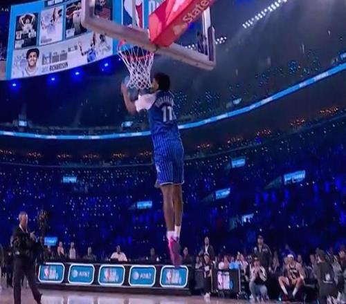 第二位登場的是魔術(shù)新秀杰斯-理查德森,他奉獻(xiàn)一記折疊背扣,得到45.4分。