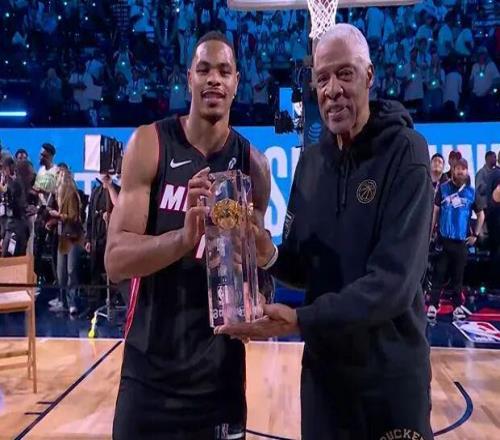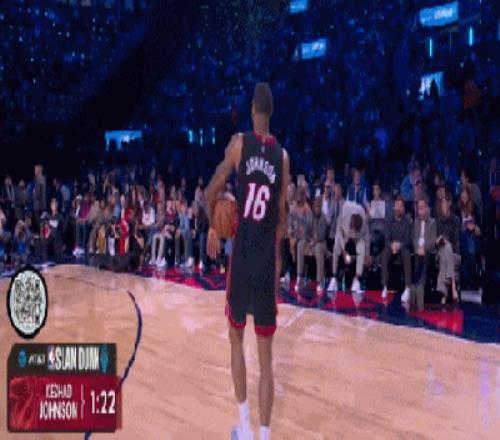 首輪最大的亮點(diǎn)是熱火的約翰遜,這哥們兒不知道從哪請來了灣區(qū)說唱老炮E-40。老頭往籃下一站,約翰遜直接起飛,飛躍這位60歲大爺?shù)耐瑫r(shí),最后摸著后腦勺單手扣進(jìn),47.4分。