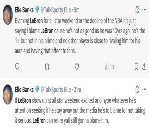 NBA記者Elle Banks寫道:如果詹姆斯在全明星表現(xiàn)的興奮且充滿激情(不管是刻意追求流量還是出于真心熱愛),那他都算正常發(fā)揮。但如果他故意避開媒體,就說(shuō)明他沒有用心對(duì)待全明星賽,那么他就要為此承擔(dān)責(zé)任,就算勒布朗退役人們也會(huì)指責(zé)他。