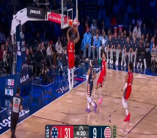 之后新星隊開始提速,華子接球回傳馬克西,馬克西上籃遭遇詹姆斯追帽,裁判吹罰干擾球,新星隊5-1反超。布克推過來傳籃下大空位杜倫,助其輕松扣籃,比分7-1;星條隊這邊,老詹控球過來左翼單挑杜倫,底線出手未果,杜蘭特補籃板后突開布克上籃,被坎寧安蓋帽,馬克西收板長傳,布克左翼三分命中,新星隊10-1擴大領先,隨后馬克西再借失誤上籃得手,12-1打停星條。