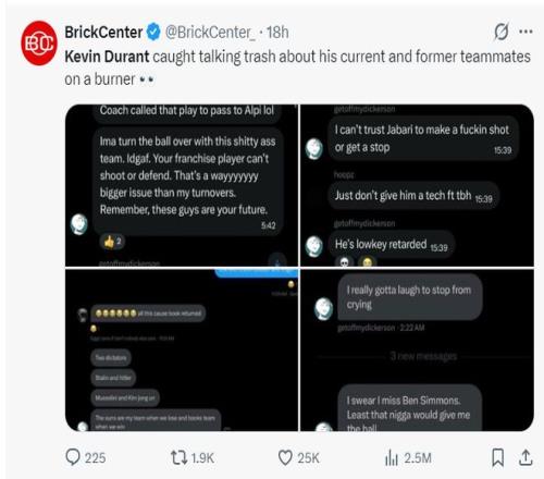 美媒BrickCenter也爆料了疑似杜蘭特小號(hào)的事件,因?yàn)檫@個(gè)賬號(hào)在社媒上各種炮轟杜蘭特的前隊(duì)友、現(xiàn)隊(duì)友。