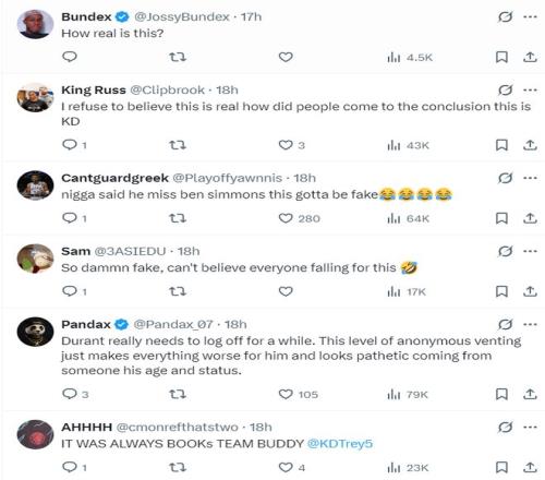 評(píng)論區(qū)的球迷們對(duì)這些言論多數(shù)是存疑的,但也有一些人覺得這像是杜蘭特的作風(fēng),希望杜蘭特本人回應(yīng)來(lái)辟謠。