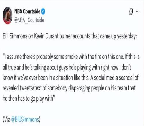 早在2017年,社交媒體上就曝光過一些推文,內(nèi)容是杜蘭特批評雷霆管理層、前主帥比利-多諾萬,甚至還有當(dāng)時的隊友拉塞爾-威斯布魯克。被問及此事時,杜蘭特承認(rèn)那些言論很“愚蠢”、“不成熟”,但也坦言自己確實有Instagram小號,用來和球迷、朋友互動。