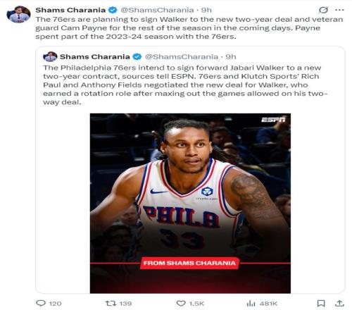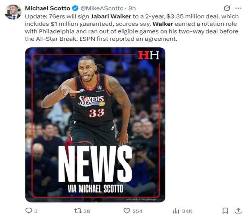 根據(jù)邁克爾-斯科特的報道,費城76人與賈巴里-沃克簽下的是一份兩年335萬的合同,而這兩年合同僅保障100萬美元。費城在全明星周末前就已經(jīng)為沃克預(yù)留了輪換位置,當他雙向合同日期截止后立馬為其辦理了轉(zhuǎn)正。