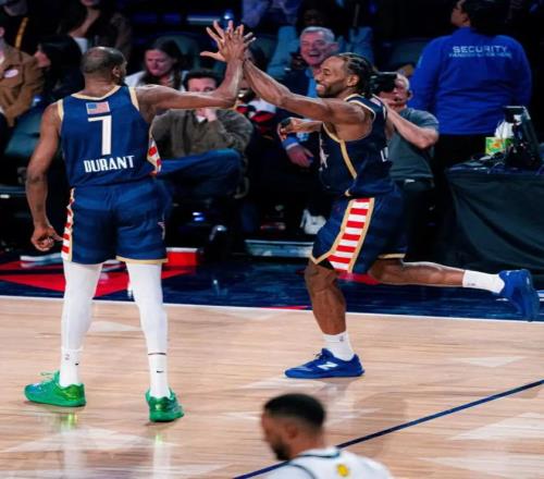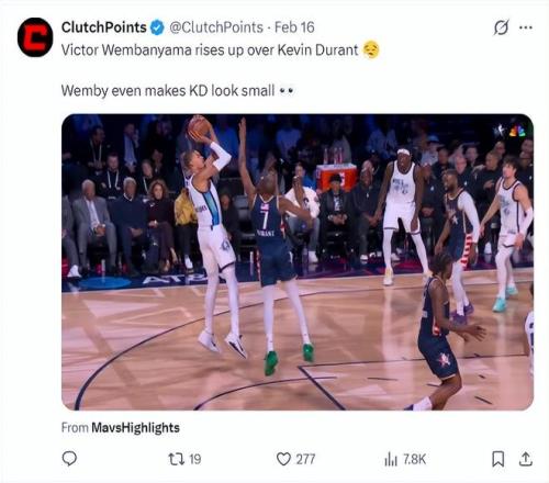 在全明星正賽中,杜蘭特防守文班亞馬時(shí),文班亞馬面對KD干拔后仰中投命中,美媒Clutchpoints寫道:跟文班亞馬比起來KD看起來都小一圈。