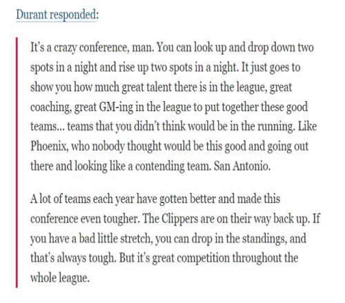 杜蘭特對西部格局的評價(jià)卻值得一看,杜蘭特說道:西部真的很瘋狂,也有可能一夜之間排名上升或下降兩位,西部存在聯(lián)盟多位頂級球員/教練/GM,他們都組建了優(yōu)秀的球隊(duì)。原本覺得不是爭冠球隊(duì)的太陽、馬刺本賽季都發(fā)揮出色。每年都有球隊(duì)進(jìn)步讓這個(gè)聯(lián)盟競爭更激烈,快船都在復(fù)蘇,西部會非常之激烈。