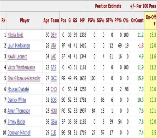 排在第四的文班亞馬ON-OFF值為11.2,排在第五的謝伊-吉爾吉斯-亞歷山大ON-OFF值為11,兩人可謂伯仲之間。文班場均24.4分11.1籃板(聯(lián)盟第四)2.7蓋帽(聯(lián)盟第一),馬刺以38勝16負(fù)的戰(zhàn)績位列西部第二,SGA場均31.8分(聯(lián)盟第二)6.4助攻,雷霆雖然沒能打破勇士73勝的常規(guī)賽歷史勝場紀(jì)錄,但仍以42勝14負(fù)的戰(zhàn)績高居聯(lián)盟榜首,他們倆進(jìn)入前五可謂實(shí)至名歸。