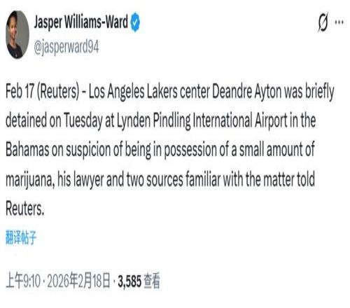 北京時(shí)間2月18日,據(jù)其律師及兩名知情人士向路透社證實(shí),洛杉磯湖人中鋒德安德烈-艾頓于今日在巴哈馬林登-平德林國(guó)際機(jī)場(chǎng)因涉嫌攜帶少量大麻被短暫扣留。