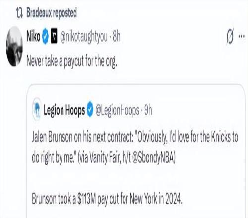 美記Niko評價(jià)布倫森的言論:永遠(yuǎn)不要為了這些球隊(duì)組織選擇降薪。(他暗示布倫森被尼克斯坑慘了)