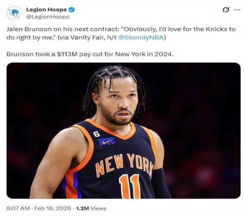 北京時(shí)間2月18日,根據(jù)美媒Sbondy NBA的消息,尼克斯球星杰倫-布倫森談到了關(guān)于下一份合同的看法,他說道:顯然,我希望尼克斯能善待我。此前布倫森在2024年夏跟尼克斯提前續(xù)約四年1.565億,他降薪額度達(dá)到1.13億美元。