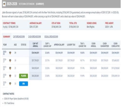 為什么說布倫森接受了1.13億的降薪呢?因?yàn)椴紓惿绻窃?025年夏續(xù)約他就能簽下五年2.69億的超級(jí)頂薪,他在2024年夏提前續(xù)約不僅頂薪要少一年,薪資總額也要少1.13億。