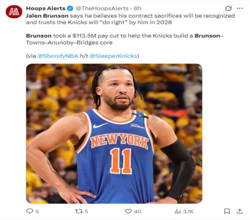 布倫森希望在2028年夏成為自由球員時(shí)公正的對待他下一份合同,因?yàn)樗鲃?dòng)接受了大幅度降薪來幫助尼克斯組建布倫森、布里奇斯、阿奴諾比、唐斯的核心陣容。