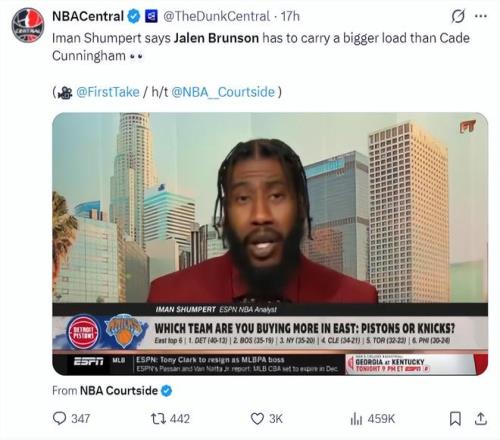 前NBA球員伊曼-香波特評價(jià)布倫森與坎寧安兩個(gè)東部頂級(jí)控衛(wèi),他表示布倫森所在環(huán)境比坎寧安難很多,布倫森要承擔(dān)的壓力遠(yuǎn)遠(yuǎn)超過坎寧安。